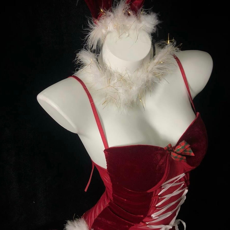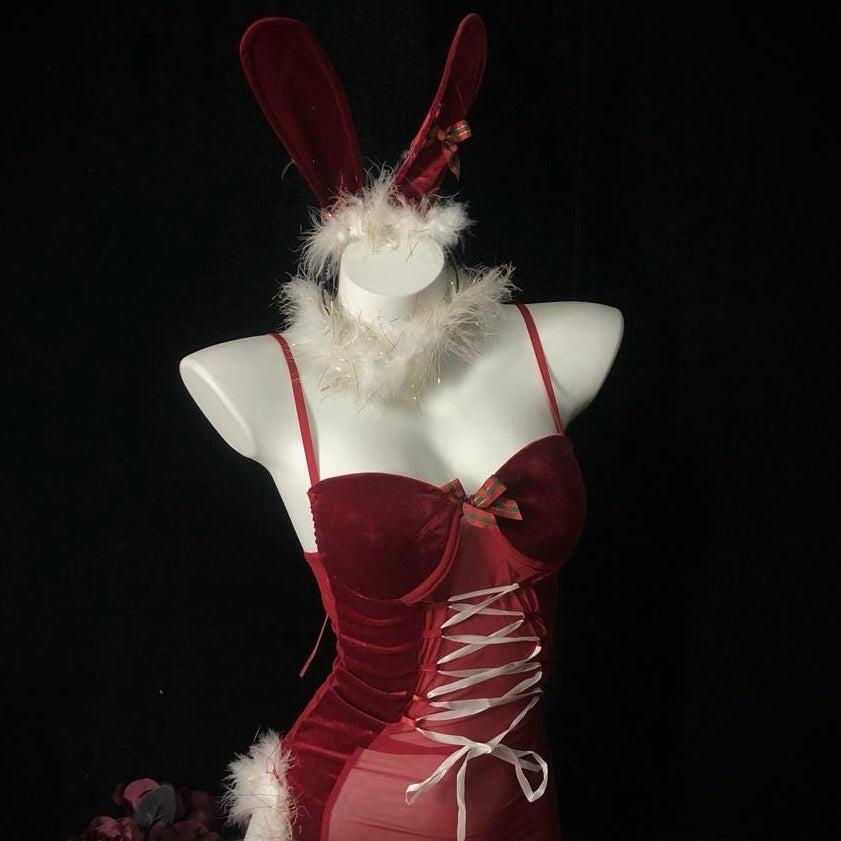 連身衣+丁字褲+兔耳朵髮箍+綁帶式手環*2+綁帶式項圈