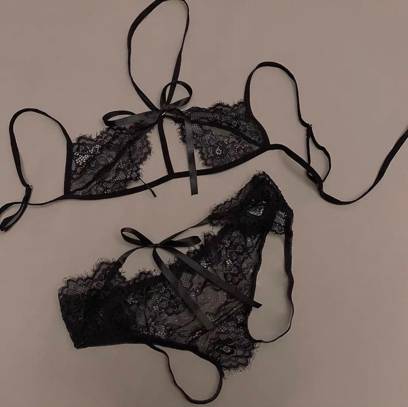 掛脖蝴蝶結蕾絲兩件式情趣內衣(3色)