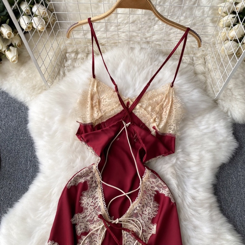 柔軟舒適緞面交叉線條蕾絲連身裙(3色)