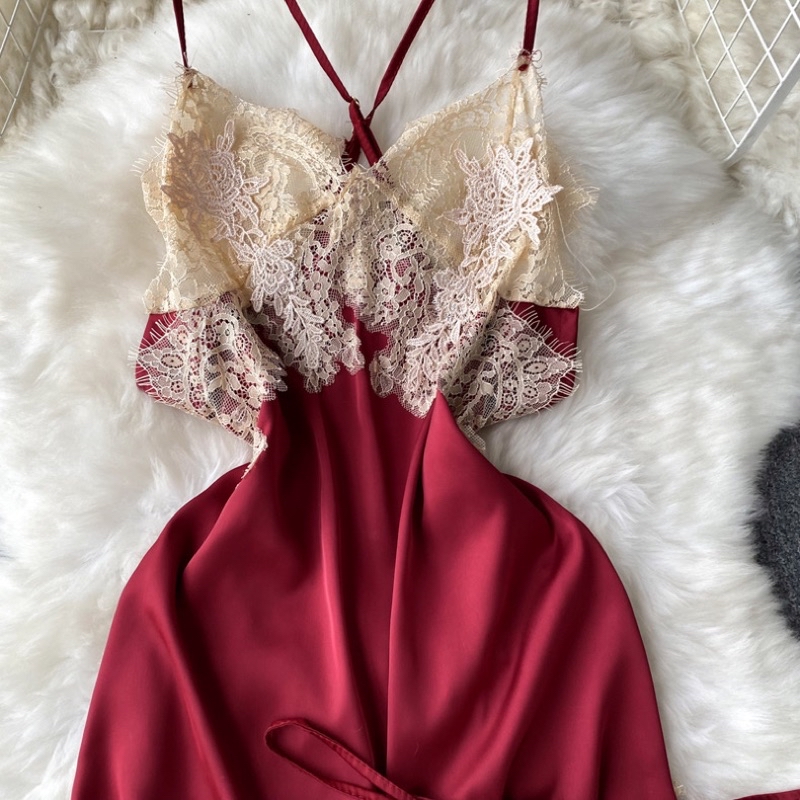 Tiny Wearhouse 小倉庫.柔軟舒適緞面交叉線條蕾絲連身睡衣🌟